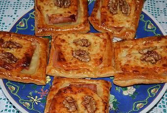Rellenamos con jamón queso de cabra y media nuez en cada cuadradito.