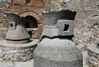 Pompeya nos muestra la vida cotidiana de una ciudad romana del siglo I con sus 89 termópolios excavados para venta de comida preparada. Panaderías no hay tantas, nos adentramos solo en dos, pero las formas de sus molinos son interesantes: la piedra fija se asemeja a un paraboloide de revolución y la móvil se aproxima a un hiperboloide.