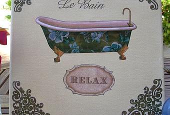 Este está hecho con un lienzo y he utilizado las técnicas de transfer y decoupage. Las esquinas, la frase Le Bain y la etiqueta de Relax van transferidas y la bañera es decoupage. Todo bien protegido con varias capas de barniz acrílico ya que van a estar en unas zonas con humedad.