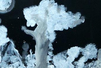 Este niño no sólo declaró con total convicción que quiere ser famoso sino que tiene ínfulas de artista: bautiza todo lo que pinta. En general, tiene predilección por los paisajes y, antes de empezar, lo curé de espanto y le dije que solo iba a usar pintura blanca. En síntesis, te presento el cuadro DIY más insólito y frugal de la historia, pintado a puro pincel seco. Lo más seco que es posible con un niño de cinco años...
