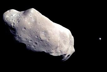 Asteroide Ida y su pequeña luna Dactyl fotografiada por la sonda de la NASA Galileo