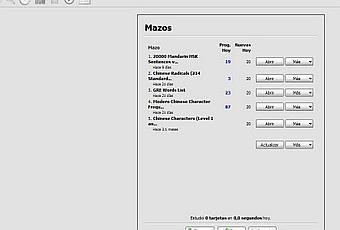 En el caso del chino, es muy útil para practicar el vocabulario del examen HSK y también para practicar o progresar en el estudio de la los caracteres chinos. Hay mazos de nivel inicial hasta niveles avanzados. Cuando abrimos un mazo tiene este aspecto: una ficha con una pregunta. El programa lleva un registro del tiempo, cantidad de fichas que practicamos y progreso, de manera que cada repaso se avanza en nuevos caracteres o frases.