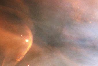 En tres dimensiones, el frente de choque de LL Orionis tiene la forma de un recipiente que parece más brillante cuando se ve a lo largo del borde. El complejo vivero estelar de Orión muestra una miríada de formas fluidas similares asociadas con la formación estelar, incluyendo el arco de choque que rodea una débil estrella que hay en la parte superior derecha. Esta imagen, parte de una composición que cubre la Gran Nebulosa de Orión, fue captada por el Telescopio Espacial Hubble