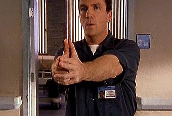 Pese a que ya profundizaré en esos casos más adelante, ahora quiero centrarme en ‘Scrubs’, una serie “de hospitales” diferente a las demás porque optaba más por el camino de la comedia pese a que a veces te hiciese llorar como una niña, y que contaba la historia de John Dorian, un joven residente que entraba a trabajar por primera vez en un hospital. Allí se encontraba con un conserje que le hacía la vida imposible y que se inventaba cada día una forma nueva de torturarle, hasta que un día, obsesionado por aquel tipo, empezaba a verlo por todas partes, incluyendo la película ‘El Fugitivo’ y donde efectivamente, el actor Neill Flynn, que interpreta al conserje, aparece unos segundos. Me parece una escena brillante.