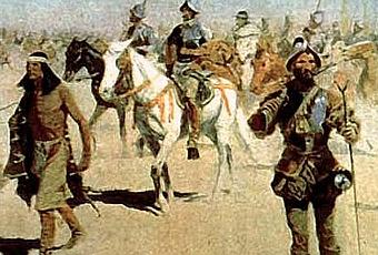 (Cuadro del pintor norteamericano Frederic Remington, 1861-1909, Expedición de Coronado, siglo XIX; Parte izquierda del tríptico del Bosco, Óleo del Jardín de las Delicias, en donde se observa ya la Fuente de la eterna Juventud, 1490; Grabado medieval de una imagen de ejército invasor musulmán; Grabado de una ilustración con el retrato de Alvar Núñez Cabeza de Vaca; Grabado con el retrato de Juan Ponce de León; Grabado con el retrato del conquistador Francisco Vázquez de Coronado.