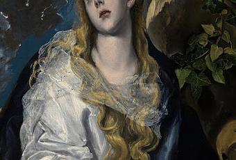 Cuando El Greco pintase a María Magdalena no lo hizo solo una vez sino varias. Fue para el pintor cretense una inspiración estética inevitablemente compulsiva. Pero, en una de ellas, compuso una vez una imagen genial por su belleza, por su simpleza y por su creativa inspiración mística. Es la extasiada figura de aquélla que compone el pintor y que reflejará ahora, simbólicamente, la representación más paradigmática de la existencia humana. ¿Quién mejor que una santa pecadora para componer a un ser tan desesperadamente inconsistente de certezas? Pero es que, además, está ahora ella situada entre dos espacios estéticos que determinarán en la obra la incertidumbre humana más trascendente y misteriosa. A la derecha de Magdalena (nuestra izquierda en el cuadro) sitúa el pintor un cielo tenebroso de nubes oscuras desparramadas, aunque, ahora, con algunos rasgos de vaga luminosidad silenciosa. A su izquierda destaca el pintor la calavera de la muerte ante un fondo terrenal más oscurecido todavía. El cielo impenetrable por un lado y la tierra maldecida por el otro. ¿Es que la existencia humana no será más que un instante poderoso y relampagueante entre dos eternidades de tinieblas? La audacia y brillantez creativa de El Greco se transformará aquí en un misterioso universo de incertidumbres. La única certeza son las manos entrelazadas de ella, todo lo demás es desolación espiritual encubierta ahora por la piadosa inclinación de un rostro que no describe, realmente, ninguna piedad compulsiva. Sus rasgos tienen la virtualidad del temor humano, ese miedo indescifrable que iniciará a ser algo impreciso y sin sentido. Miran sus ojos hacia el único lugar que está ahora tan lejos como la mera sensación de seguridad que no hallará en sí misma. Pero su cuerpo, su figura humana, está ahora dirigida, sin embargo, hacia la tierra oscurecida de la muerte. Las manos hacia la tierra y su mirada hacia las nubes. ¿Dónde estará la verdad para una existencia tan postrada y sin certezas?