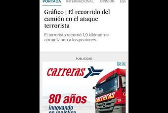 Otras veces la publicidad estará relacionada con la información consumida por el usuario. Así, si leemos una noticia sobre la etapa de hoy del Tour de Francia, es posible que en nuestra pantalla nos muestre publicidad sobre bicicletas o material deportivo. Sin embargo, esta publicidad generada automáticamente no siempre es efectiva. Y otras veces, dependiendo de según qué noticias, puede resultar fuertemente inconveniente o, como en el caso de hoy, macabra. Cuando el diario El País publicó el titular el recorrido del camión en el ataque terrorista, recogiendo información sobre el atropello multitudinario llevado a cabo en la ciudad francesa de Niza que acabó con la vida de más de 80 personas, tras la noticia aparecía la publicidad de una empresa de transporte española (Grupo Carreras) mostrando el frontal del un camión. Evidentemente, se trata de una mera relación semántica, pero con un resultado nefasto, que debería haber sido evitado por los responsables de publicidad del periódico. alfonsovazquez.com ciberantropólogo