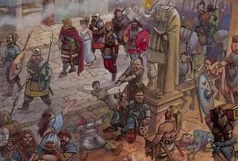 Germanos saqueando una ciudad gala( Il. Ken Broeders. Cómic El Apóstata. Yermo Ediciones)