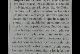 El primero aparece en el recorte de prensa: muchos jefes "recompensan" a sus trabajadores más eficientes con... ¡chantatachan!... más trabajo. Pues sí, cuando un trabajador acaba sus tareas en plazo y además lo hace bien, sus jefes les bombardean con nuevas tareas. Y se agobian. Y se van, y además con razón.