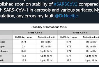En una investigación realizada por un equipo de especialistas de las universidades de Princeton y California, Instituto Nacional de Salud (NHI) y del Centro de Control y Prevención de Enfermedades (CDC) de los EEUU se logró conocer el tiempo de supervivencia del virus COVID-19 frente al SARS-CoV-1.