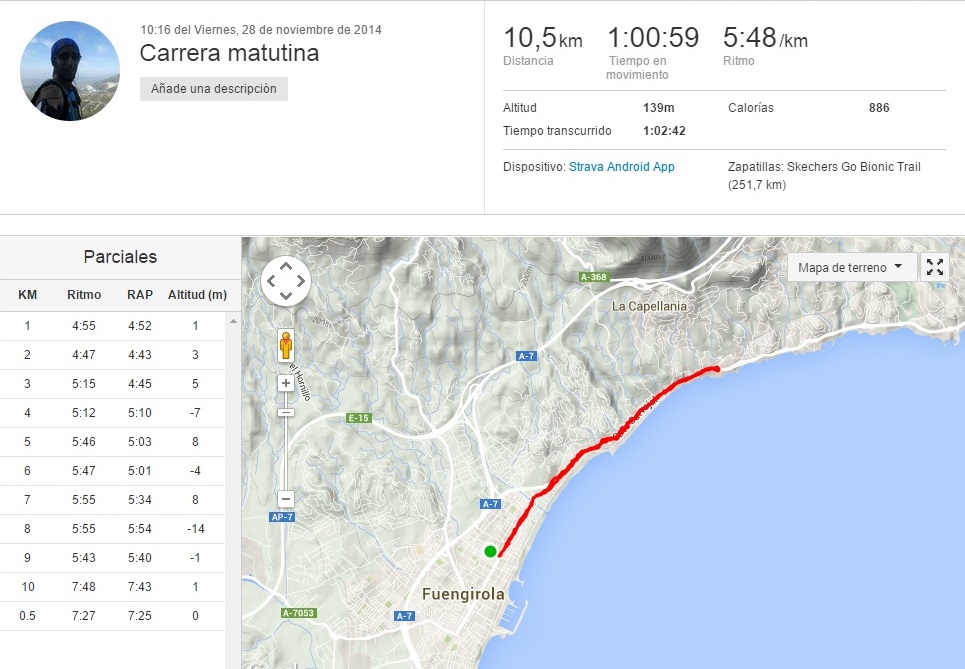 Km 10,5 - 7:27 min/km (miércoles en 5:11 min/km): Tras recorrer casi un kilómetro andando, consigo volver a trotar de nuevo, totalmente acojonado ya que no noto absolutamente nada en mi rodilla izquierda, y no sé si puede volver a crujir; bajo la cuesta de la ermita y entro en mi calle, mientras troto con cautela y, poco a poco, comienza a volver la molestia, aunque sin llegar a provocar dolor esta vez.