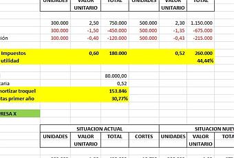 - Establezca economías de escala y logre costos unitarios más bajos. Veamos un ejemplo: la empresa X vende al año 300.000 productos con un precio de 2,50 unidades monetarias (UM) cada producto. El proveedor le entrega a X el producto listo para vender, con un costo unitario de 1,50 UM cada artículo. La utilidad neta antes de impuesto es de 0,60 UM/articulo. Según los pronósticos del departamento de ventas, el mercado podría absorber 200.000 productos adicionales dado los nuevos diseños que se tienen previstos, sobre todo si se puede disminuir el precio a 2,30 UM cada producto. En la actualidad se trabaja con un troquel de solo 16 unidades y por lo tanto se requieren 18.750 cortes. Ambas empresas llegaron a un acuerdo: si A compra un troquel de 30 unidades (capacidad máxima de la maquina de corte), el proveedor garantiza un costo unitario de solo 1,35 UM. Es decir, A se ahorra en cada artículo 0,15 UM. Si el troquel nuevo tiene un costo de 80.000 UM, se cubre con la utilidad antes de impuestos generada por las primeras 153.846 unidades. Es decir, con la venta del 30,77% de las unidades del primer año, se amortiza totalmente el nuevo troquel. Los gastos de operación se ven incrementados por el aumento del gasto de personal administrativo y publicidad. Según se muestra en el siguiente cuadro ambas empresas salieron ampliamente beneficiadas, ya que el proveedor también incrementó sus ventas en un 50% y redujo el número de cortes a 16.667, lo que implica menos horas/hombre, menor depreciación de sus equipos y disponibilidad de utilizar su capacidad productiva para nuevos negocios.
