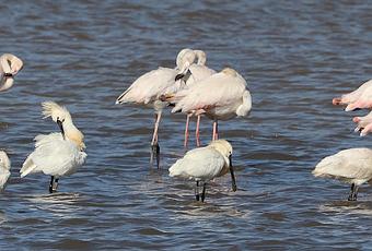 Las espátulas en medio del cauce, con las anillas visibles, comparten espacio con los flamencos.