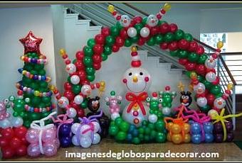 Primero tenemos esta decoración hecha cien por ciento con globos, vemos que se ha hecho un gran muñeco de nieve, un árbol y un arco enorme con los colores representativos de la navidad, esta decoración es perfecta para la fachada de una casa, aquí te mostraremos algunos adornos decorativos para navidad.