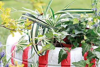 1.-El primero como ya habéis podido apreciar es un neumático viejo al que hemos pintado de blanco con rayas rojas y le hemos introducido macetas de diferentes plantas, unas colgantes y otras con un pequeño toque de color. 2.-Una cómoda antigua, en esta ocasión se ha pintado de un color llamativo, y se han utilizado los cajones para poner tierra y plantas. El cajón de arriba con plantas de menos tamaño y el cajón de abajo mas abierto y con plantas mayores de mayor altura.