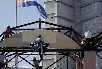 Un grupo de operarios trabaja en el montaje del altar en La Habana desde el cual Benedicto XVI oficiará una misa