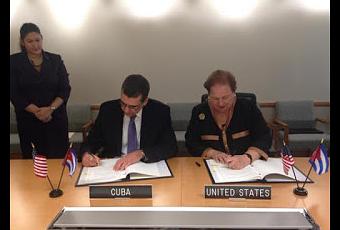 En la tarde de este miércoles 18 de enero, se firmó en la sede del Departamento de Estado, en Washington, el Tratado entre la República de Cuba y los Estados Unidos de América, sobre la Delimitación de la Plataforma Continental en el Polígono Oriental del Golfo de México más allá de las 200 Millas Náuticas.Por la parte cubana rubricó el acuerdo José Ramón Cabañas Rodríguez, embajador de Cuba en los Estados Unidos, y por la parte estadounidense, Mari Carmen Aponte, consejera especial para los Asuntos del Hemisferio Occidental del Departamento de Estado.