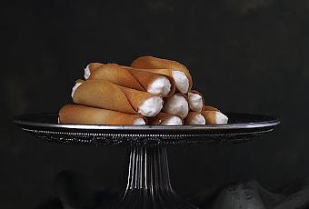 Tamizar la harina y el azúcar glass y mezclarlos con todos los demás ingredientes. Precalentar el horno a 180º con calor arriba y abajo. Sobre un silpat hacer discos translúcidos (finos). Meter en el horno y cuando los bordes se empiecen a dorar sacarlos. Se hacen muy rápido, en unos 3 minutos los tienes listos. Enrolla cada círculo en el palo de una cuchara de madera. Mete discos de tres en tres porque si no la masa se enfría y ya no se puede doblar.