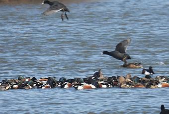 un numeroso grupo de patos cuchara nadando muy juntos y dando vueltas al unísono como estrategia para conseguir alimento.