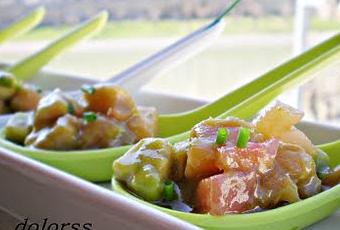Ingredientes para unas 6-8 cucharillas: 50-60 gr. de salmón marinado (aquí) ½ aguacate 1 tomate rojo carnoso un poco de jugo de limón