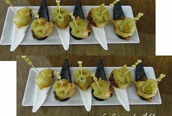 El pisto, ya lo tenemos hecho, y los pimientos parados con tempura, y fritos junto con el bacalao, montamos las cucharillas.