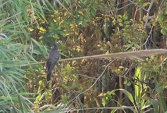 El cuco común (Cuculus canorus) se mimetiza entre la densa vegetación del Parc Fluvial Besòs, rodeado de cañas y diversas plantas leñosas.