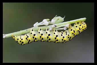 "Oruga de Cucullia lychnitis, lepidóptero de la familia Noctuidae. Se distribuye por Europa, Cercano Oriente y Oriente Medio. Las larvas se alimentan de plantas del género Verbascum."