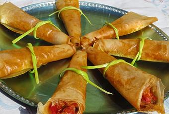 5- Cortar la pasta en medias lunas, Pincelar una media luna con mantequilla fundida, sobreponer otra encima para que se queden pegadas, colocar en el extremo una cda. del relleno, pincelar los bordes y enrollar en forma de cucurucho.
