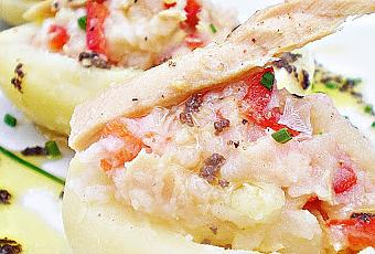 Hervir las patatas con piel, lavadas, en agua y sal durante unos 30 minutos. Enfriar y pelar. Vaciarlas con cuidado de no perforar el fondo, con una cucharilla o un sacabocados. Reservar.