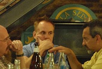 En ella parece que el gran Eduardo Risso (a la derecha) trata de convencer al guionista de 100 balas, Brian Azarello y al editor de Will Dennis, de que puede mover las botellas solamente con su poder mental.