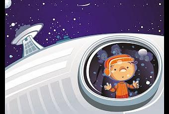 Entraron en el cuarto y la puerta se cerró; el cuarto realmente estaba muy oscuro. Ante ellos se abría un inmenso ojo de vidrio, el ojo de buey, una ventana de metro y medio de alto por dos de ancho, por la cual podían ver el espacio. El niño se quedó sin aliento, maravillado. Detrás, el padre y la madre contemplaron el espectáculo, y entonces, en la oscuridad del cuarto, varias personas se pusieron a cantar.