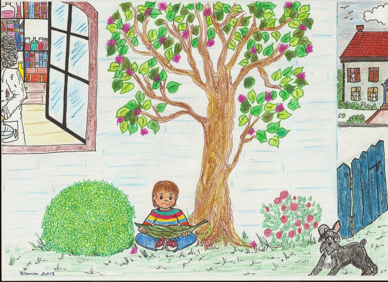 - PUES.....ES QUE..., ¡A MAMÁ, NO LE GUSTA QUE ME MANCHE LA ROPA! Y VOSOTROS ¡TENÉIS EL DELANTAL MUY SUCIO! Y TOCÁIS COSAS QUE MANCHAN, ¡QUE YO LO VI! - DIJO EL NIÑO- ¡PERO ESO NO ES NINGÚN PROBLEMA! -RESPONDIÓ MARIE ABRIENDO MUCHO LOS OJOS- TU MAMÁ NOS HA DEJADO UN DELANTAL PARA TÍ, Y LE DA IGUAL SI TE MANCHAS. ADEMÁS, NOSOTROS TENEMOS UN REGALO PARA TI: UNA LUPA, LÁPICES Y COLORES Y UNA LIBRETA, PARA QUE DIBUJES LO QUE QUIERAS. ¿QUIERES PASAR AHORA? YA SABES QUE TU MAMÁ TE DEJA VENIR A NUESTRA CASA.- ¡SIIIII!-DIJO NANDO CONTENTO- PUES VENGA, DA LA VUELTA AL PATIO Y EMPUJA LA PUERTA DE ENTRADA. ¡ESTÁ ABIERTA!-DIJO BERTOY NANDO, CORRIENDO TANTO COMO CUANDO VEÍA UNA AVISPA CERCA DE SU CARA, ENTRÓ EN CASA DE LOS CIENTÍFICOS.
