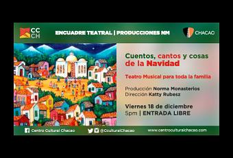 El evento de teatro musical “Cuentos, cantos y cosas de La Navidad”, del grupo Encuadre Teatral, se presentará este viernes 18 de diciembre a las 5:00 p.m., en la Sala Experimental del CCCH-Centro Cultural Chacao. Un espectáculo para chicos y grandes que evoca historias de la navidad venezolana, con cantos autóctonos navideños de nuestro folklore nacional. Entrada libre.