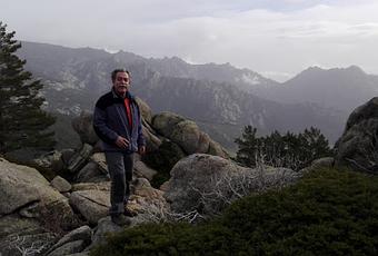 Detrás de mí, el sendero nos situará en el peñasco fornido de Cancho Porrón. El pinar del fondo es la Maliciosa Chica.Entramos por un callejón a la Cuerda por el Collado Porrón. Han bajado las nubes y han subido las pulsaciones, la vista dilata su espacio entre pequeñas lágrimas del encapotado cielo. El viento nos abraza como si fuéramos héroes entre el bóreas y el céfiro. Las rocas ofrecen su espacio de oquedad y refugio mientras comemos los frutos secos.