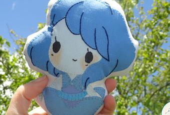 Teresa es mi sobrina, la más pequeña, 12 años, una gran melena, una mirada alegre y un espíritu generoso. Me pidió que le hiciera a su amiga Marina un muñequito lo más fiel posible a Lapis de Steven Universe. Me mandó el dibujo original y yo busqué entre mis telas azules. Con una aplicación festoneada reproduje lo más fielmente que pude el personaje que hasta ese momento desconocía. Lo rellené de miraguano (o floca, o guata, o como tú lo quieras llamar) y se convirtió de este modo en un cojincito blandito (requisito imprescindible), del tamaño de una mano (también importante) con Lapis como protagonista.