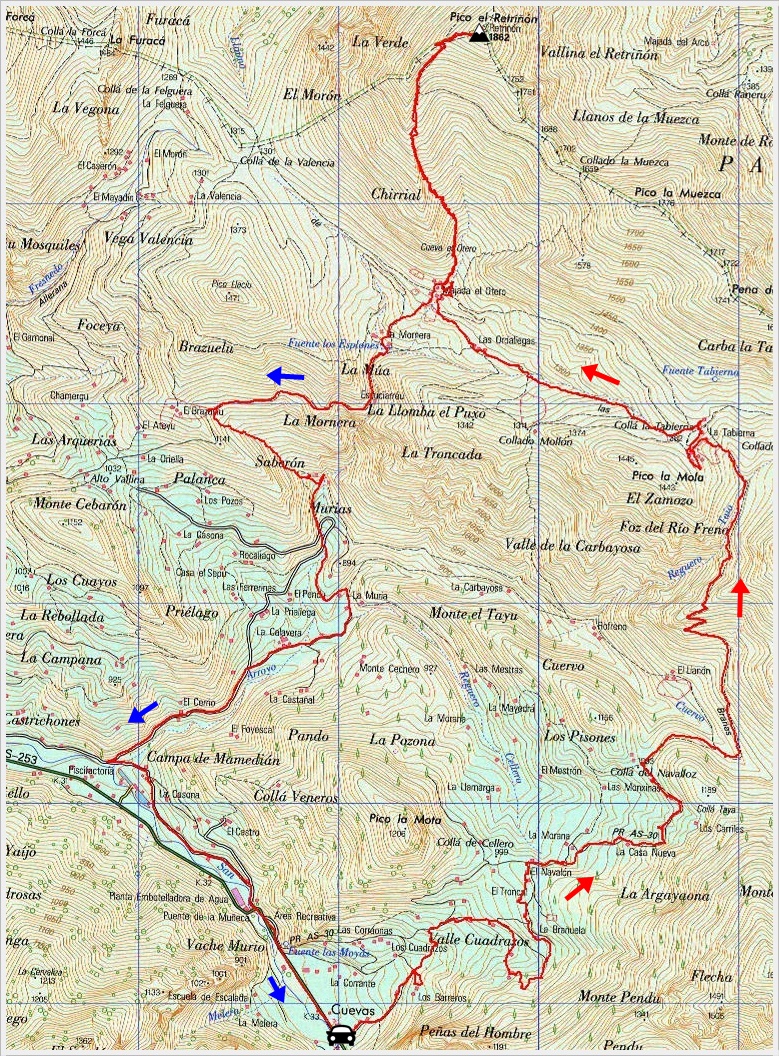 Fecha: 01-Enero-2019 Situación geográfica: Cordal del Retriñón (El Pino, Ayer) Itinerario: Cuevas-Los Barreos-Penoa-El Troncal-El Praón-El Praixal-Las Piedras-La Col.lá Cel.lero-La Casa Nueva-Los Carriles-L´Argayá-La Campona-La Casa Vieya-El Navayó-La Sienda la Tabierna-La L.lombeta-La Tabierna-Las Ordaliegas-L´Otero-El Mayéu Retriñón-El Pico Retriñón (1862 m)-L´Otero-La Mornera-L´Escú Zarréu-La Val.lina Cuirgo-La Mornera Baxo-El Resel.lón-Las Murias-El Paxarín-La Calavera-Recuirgo-El Calero-Mamedián-La Moneca-Cuevas Tipo de ruta: Circular Desnivel positivo acumulado: 1510 m Distancia recorrida: 21 km Observaciones: En este reportaje los sitios del monte aparecen escritos tal y como los nombran y conocen los lugareños respetando la toponimia tradicional y autóctona, evitando en lo posible los numerosos y aberrantes errores de ubicación y de escritura que proliferan en los mapas y publicaciones al uso por malas interpretaciones o desconocimiento. Me gustaría agradecer la colaboración que hemos recibido por parte de varios lugareños -Che y Jose, entre otros- que muy amablemente nos han concedido parte de su tiempo y atención para ser entrevistados en la recogida de topónimos