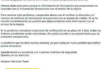 "Hemos bloqueado su cuenta de Amazon y todos sus pedidos pendientes", se lee en el email fraudulento.