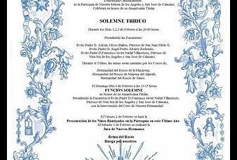 La Hermanda de Ntra. Sra. del Rocío de Montequinto celebrara su triduo los próximos días 1, jueves; 2, viernes; y 3, sábado, de febrero, a las 20 horas en nuestra Parroquia de Ntra. Sra. de los Ángeles y San José de Calasanz. E próximo día 2, viernes, se realizaáa la Jura de las Reglas a ...