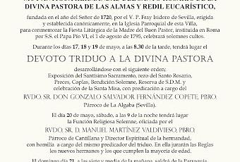 Durante los días 17, 18 y 19 de mayo, a las 8.30 de la tarde, tendrá lugar el DEVOTO TRIDUO A LA DIVINA PASTORA desarrollándose con el siguiente orden; Exposición del Santísimo Sacramento, rezo del Santo Rosario, Preces, Coplas, Bendición Solemne, Reserva de S.D.M. y celebración de la Santa Misa, con predicación a cargo del RVDO. SR. DON GONZALO SALVADOR FERNANDEZ COPETE, PBRO. Párroco de La Algaba (Sevilla).El día 20 de mayo, sábado, a las 9 de la noche tendrá lugar la Función Religiosa Solemne, oficiada por el RVDO. SR. D. MANUEL MARTINEZ VALDIVIESO, PBRO. Párroco de Cantillana y Director Espiritual de la hermandad con homilía a cargo del mismo predicador del triduo. En ella jurarán las Reglas los nuevos hermanos y los que cumplen la mayoría de edad.El domingo día 21, a las siete y media de la mañana, saldrá de la Parroquia, como establecen nuestras Reglas, el Santo Rosario de la Aurora hacia el Santuario de la Divina Pastora, donde a su llegada se celebrará la Santa Misa.A las 12 del mediodía, tras el rezo del REGINA COELI, la peregrina imagen de la Divina Pastora de las Almas quedará expuesta en BESAMANOS y recibirá la ofrenda de flores de los pastorcitos. Al mismo tiempo todos los hermanos podrán depositar una OFRENDA SOLIDARIA DE ALIMENTOS.A las 10 de la noche se rezará el ejercicio piadoso de las SIETE AVEMARÍAS por las siete letras que componen el Dulce Nombre de PASTORA, y se cantará la Salve Solemne.A continuación tendrá lugar el traslado de la Divina Pastora en Procesión Claustral, desde la Capilla Mayor de la Parroquia hasta el Camarín de su Capilla, terminándose el acto con el canto del Himno Pastoreño.En todos estos cultos participará el Coro de la Hermandad.Cantillana, mayo de 2023.