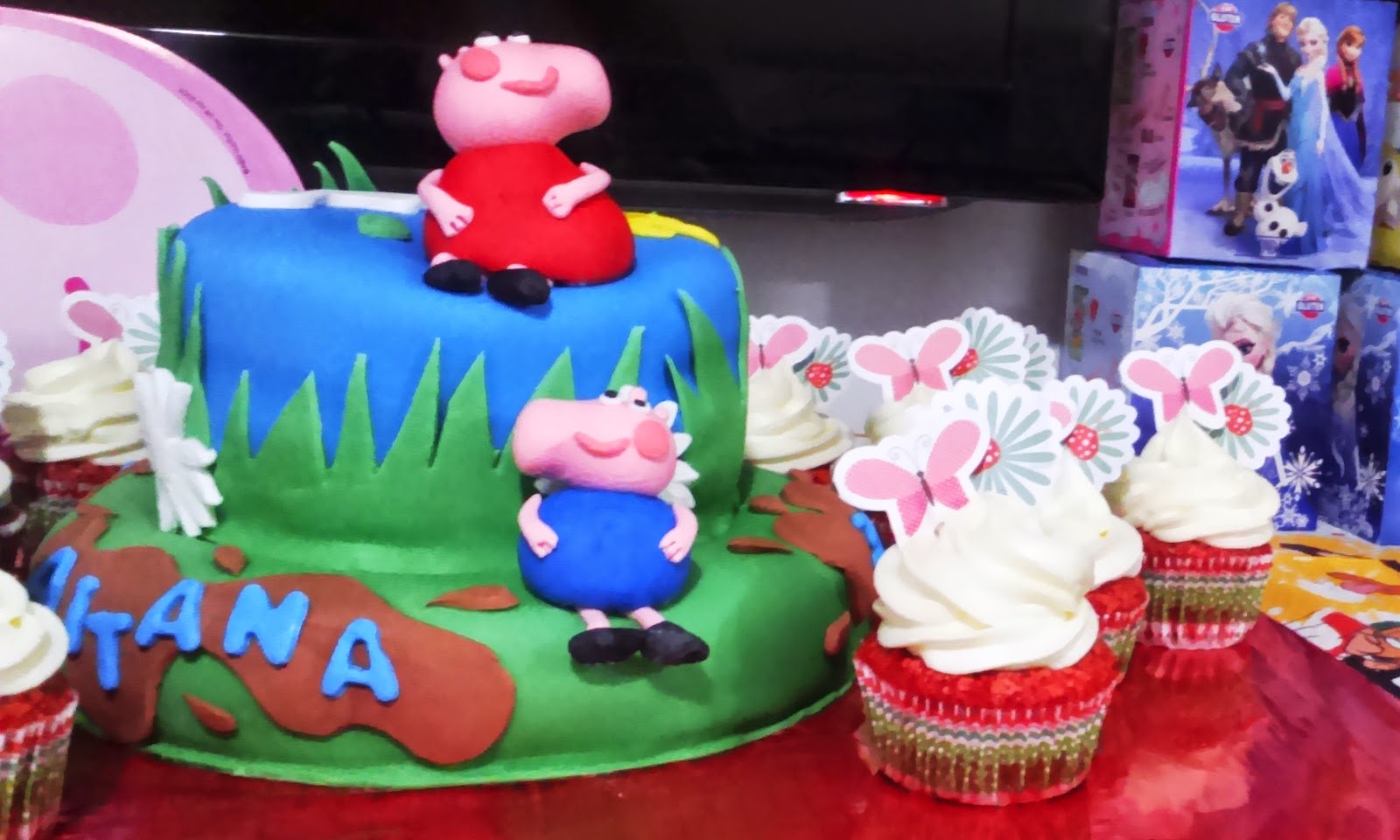 A Peppa y George los hice con la ayuda de un video de You Tube que me fue de mucha ayuda!!! La Tarta la hice como casi todas las que hago de fondan, bizchoco de vainilla y relleno de dulce de leche. Para la parte de arriba utilicé 3 moldes de Layer cake de 15 cm cada uno y para abajo, 2 molde desmontables de 25 cm.