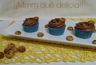 - Con ayuda de unas cucharas o con un servidor de helador, en mi casa conocido como "bolichero", llenamos de masa 2/3 de cada cápsula. Añadimos unas chip más por encima y metemos nuestro cup cakes en el horno durante unos 20 minutos o hasta que al pincharlos con una aguja esta salga seca.