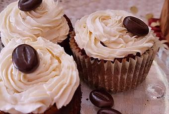 2.- Incorporamos la harina tamizada con el bicarbonato sódico, mezclamos con una espátula de silicona y con movimientos envolventes para que la masa no pierda volumen. Vertemos la masa en capsulas de magdalenas. Cocemos los cupcake de café 20 o 25 minutos, los retiramos del horno y dejamos que se enfríen sobre una rejilla para que pierdan la humedad que se desprende de ellos.3.- Paramos la crema de vainilla: En un bol añadimos la nata con el azúcar, batimos con las varillas eléctricas hasta conseguir una nata cremosa. Añadimos la esencia de vainilla sin dejar de batir. Disponemos en una manga pastelera la nata y decoramos los cupcake de café con la nata de vainilla y los granos de café con aroma de chocolate.