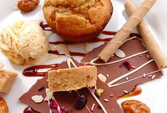 En este caso he puesto el cupcake, dos barquillos de turrón, un par de trozos de turrón blando, almendras garrapiñadas, helado de vainilla, caramelo liquido en la base y unas láminas de chocolate que se hacen fundiendo chocolate y extendiendo y añadiendo chocolate blanco fundido y frutos secos o decoración variada y dejando enfriar.