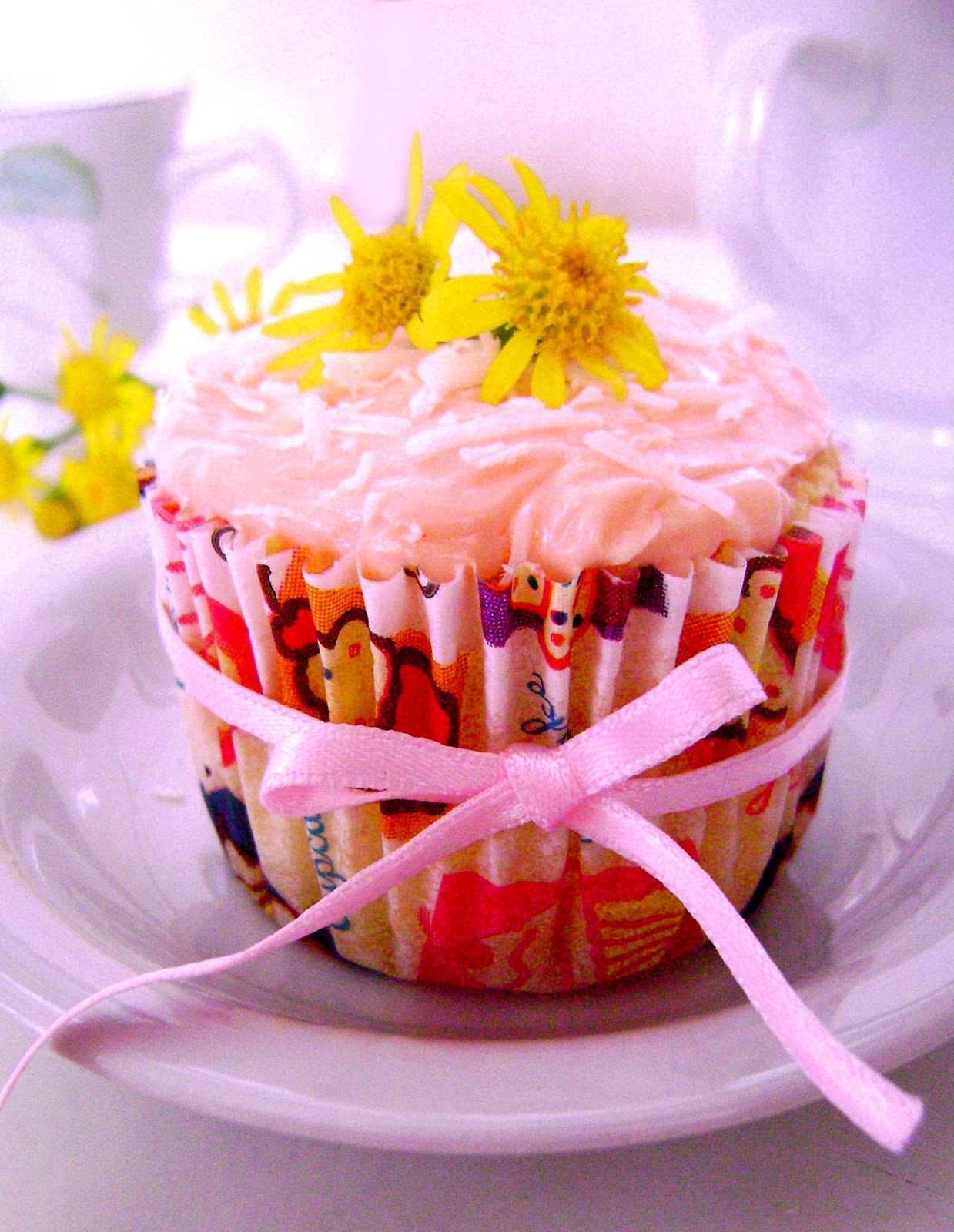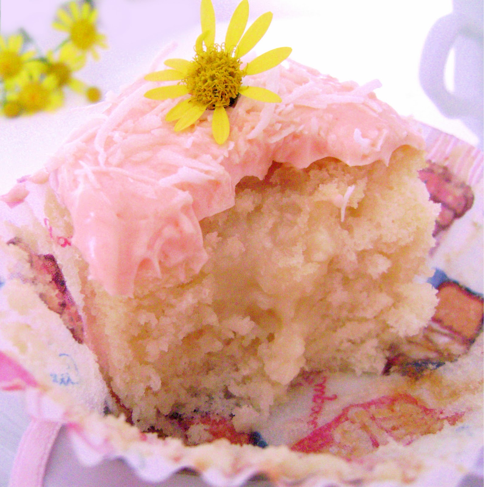 Bate el azúcar con la leche, vainilla y colorante hasta quedar cremoso. Si necesario añade un poquito más de azúcar. Cubre los cupcakes con el buttercream y espolvorea con coco rallado.