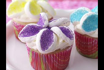 Para la decoración, rebane cada una malvavisco en 5 rondas a lo ancho. Presione uno de los lados de la rebanada en azúcar de colores. Acomode las rebanadas en el cupcake para asemejar los pétalos de flores. Refrigere hasta servir.