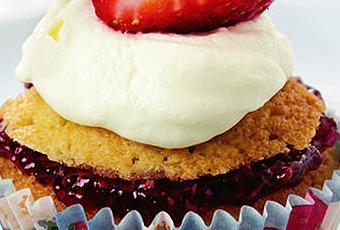 Retire los cupcakes del horno y deje enfriar en una rejilla. Corte las superficies de los cupcakes y unte mermelada, vuelva a colocar las superficies.