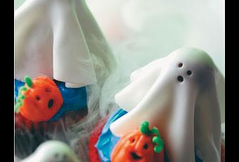 En una superficie ligeramente espolvoreada con azúcar glass, aplanar el fondant con un rodillo, cortar un circulo con un cortador de galletas, organizar sobre una pila formada anteriormente. Para los ojos y la boca, con suavidad pintar con un lápiz comestible negro. Repita el procedimiento para los fantasmas restantes.