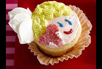 Para hacer el cupido, tinte el frosting de vainilla con unas gotas de colorante rojo y amarillo para que quede de color melocotón; unte el frosting en los cupcakes. Utiliza la fotografía como una guía, con el frosting amarillo haga el pelo del cupido. Use el glasee rojo y azul para los ojos y boca. Coloque la gomita de corazón en un lado de la cara.