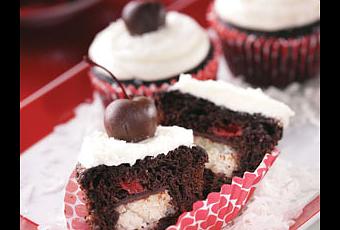 Retire del refrigerador el ganache, poco a poco mezclar con el azúcar glass hasta que el frosting este ligero y esponjoso. Unte el frosting en los cupcakes, espolvorear azúcar encima de los cupcakes. Adornar con las cerezas bañadas en chocolate.