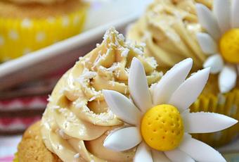 - Rellenamos una manga pastelera con esta preparación y decoramos la superficie de nuestros cupcakes. Espolvoreamos coco rallado y terminamos con unas margaritas hechas de fondant.